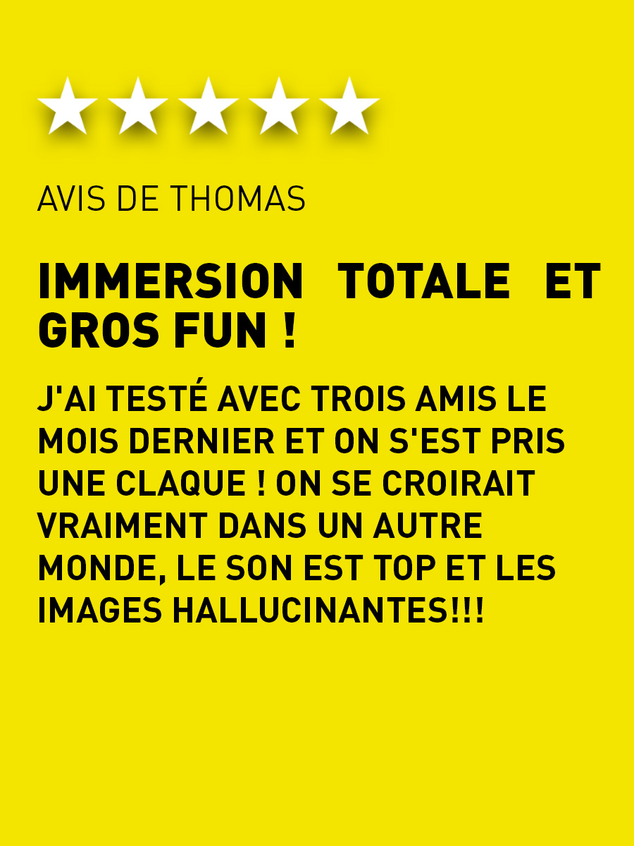 Immersion totale et gros fun! J'ai testé avec trois amis le mois dernier et on s'est pris une claque ! On se croirait vraiment dans un autre monde, le son est top et les images hallucinantes!!!